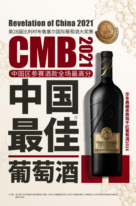 由青島華東葡萄釀酒有限公司選送的“華東·百利酒莊2018典藏赤霞珠干紅葡萄酒”雙喜臨門,同時摘得中國區(qū)參賽酒款最高分獲比賽大金獎和唯一“CMB-2021中國最佳葡萄酒”兩項大獎。此外,選送的“華東·百利酒莊2016珍藏莎當妮”榮獲大賽銀獎。